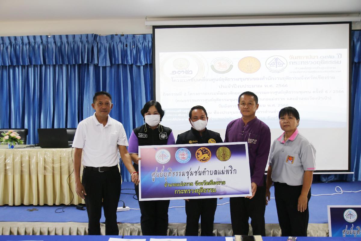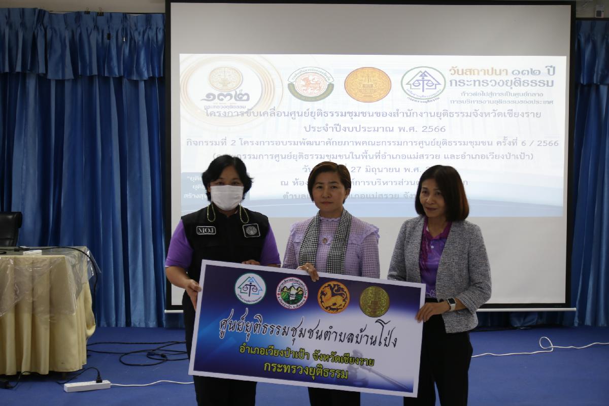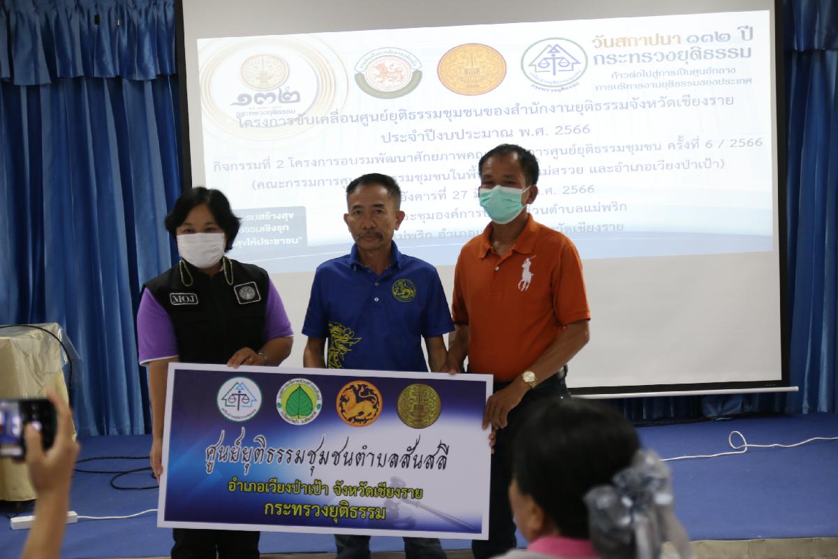 กิจกรรมที่ 2 โครงการอบรมพัฒนาศักยภาพคณะกรรมการศูนย์ยุติธรรมชุมชน ครั้งที่ 3/2566 (คณะกรรมการศูนย์ยุติธรรมชุมชนในพื้นที่อำเภอแม่สรวย และอำเภอเวียงป่าเป้า)