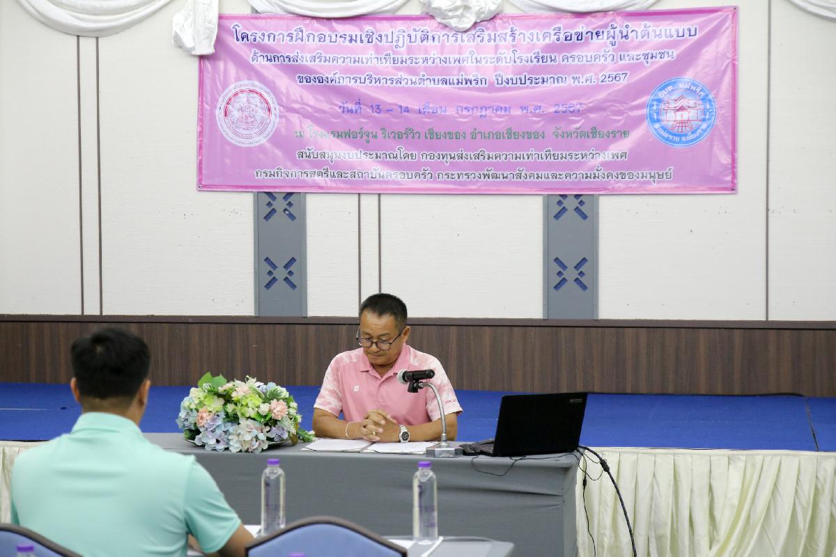 กรมกิจการสตรีและสถาบันครอบครัว ร่วมกับ องค์การบริหารส่วนตำบลแม่พริก ได้จัดโครงการฝึกอบรมเชิงปฏิบัติการเสริมสร้างเครือข่ายผู้นำต้นแบบ ด้านการส่งเสริมความเท่าเทียมระหว่างเพศในระดับโรงเรียน ครอบครัว และชุมชน ขององค์การบริหารส่วนตำบลแม่พริก ปีงบประมาณ พ.ศ. 2567 ระหว่างวันที่ 13-14 กรกฎาคม 2567 โดยได้รับเกียรติจาก นักพัฒนาสังคม พมจ. จังหวัดเชียงราย เป็นวิทยากร บรรยายและแลกเปลี่ยนเรียนรู้่ การวิเคราะห์สถานการณ์ การปฏิบัติตนต่อการแก้ไข้ปัญหาความขัดแย้งและการส่งเสริมความเท่าเทียมระหว่างเพศในครอบครัว โรงเรียน และชุมชน และมีกิจกรรมพัฒนาทักษะการเป็นผู้ปกครอง ครูต้นแบบ รวมถึงการฝึกเขียนแผนการแก้ไข้ปัญหาความขัดแย้ง การส่งเสริมความเท่าเทียมระหว่างเพศในครอบครัว โรงเรียน และชุมชน ณ ณ โรงแรมฟอร์จูน ริเวอร์วิว เชียงของ อำเภอเชียงของ จังหวัดเชียงราย