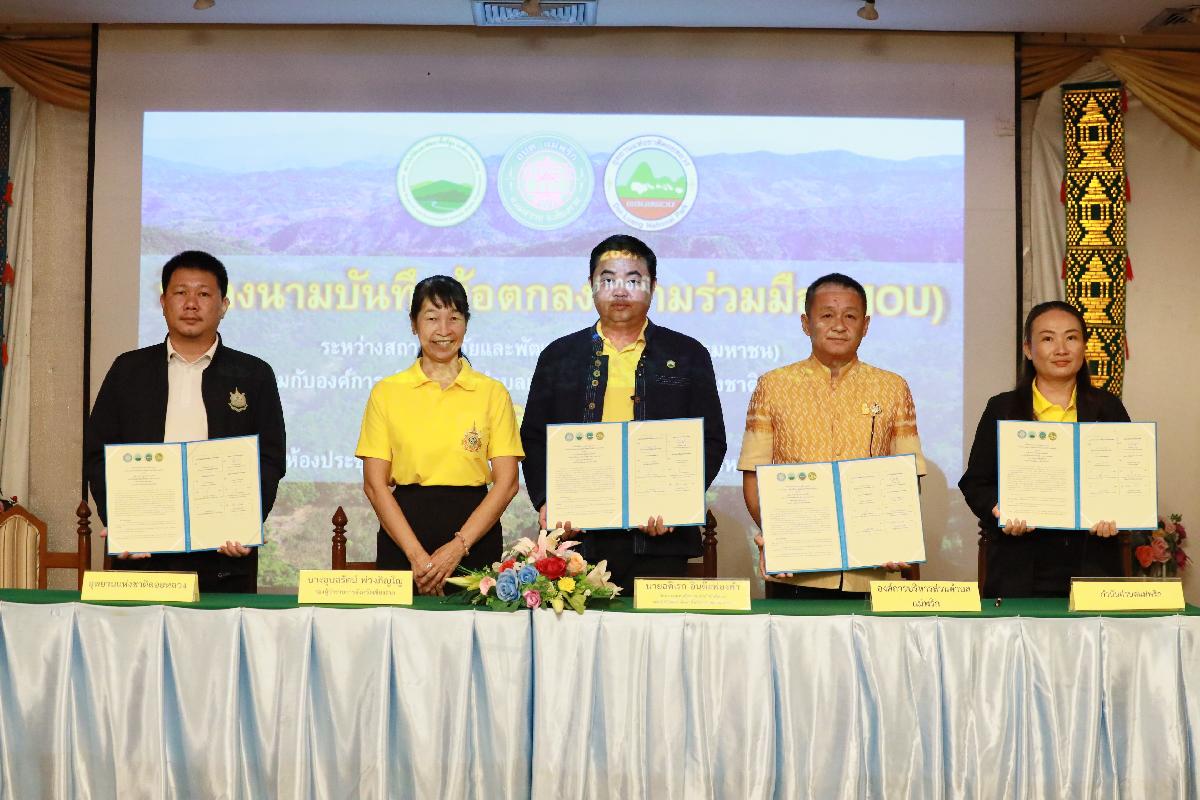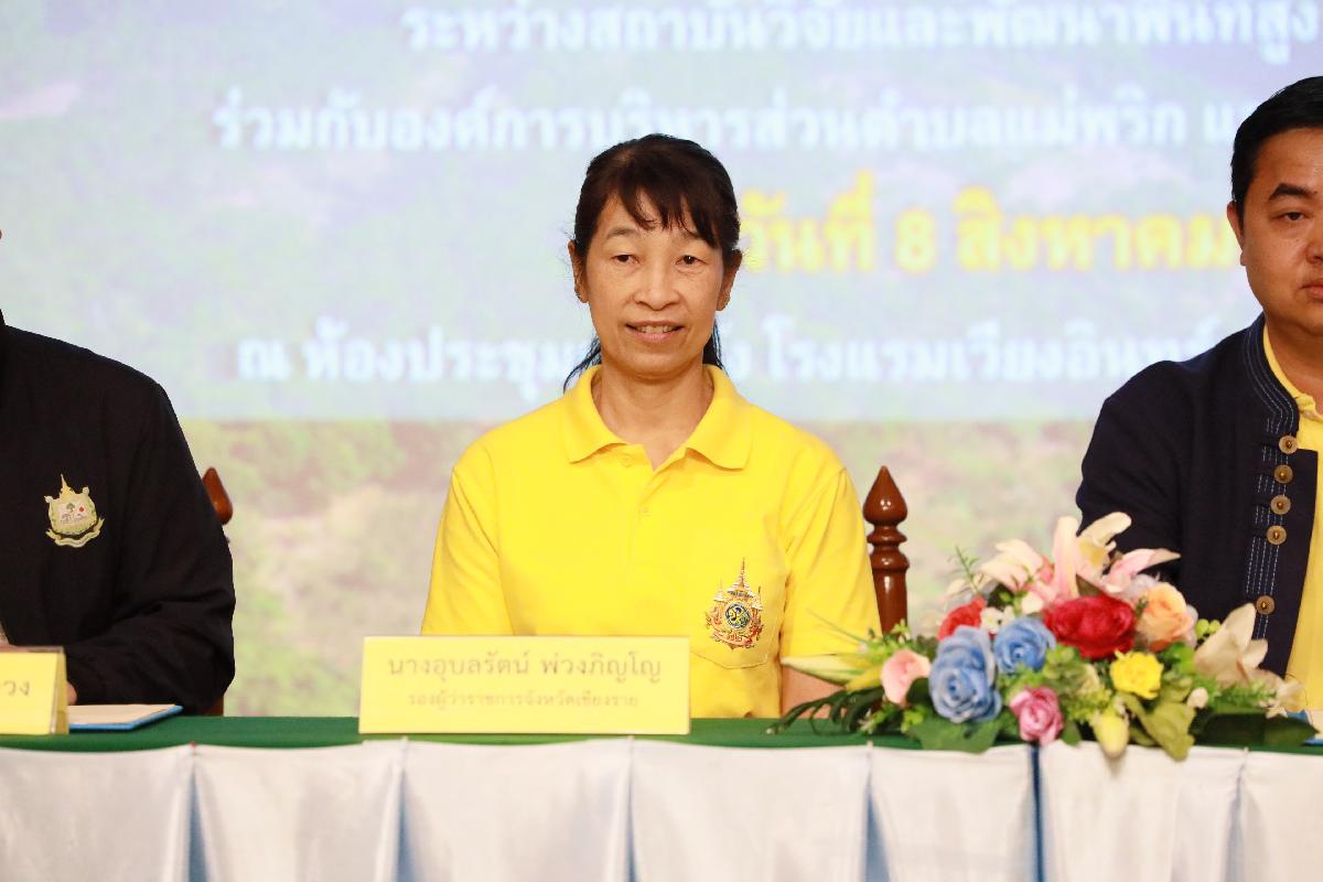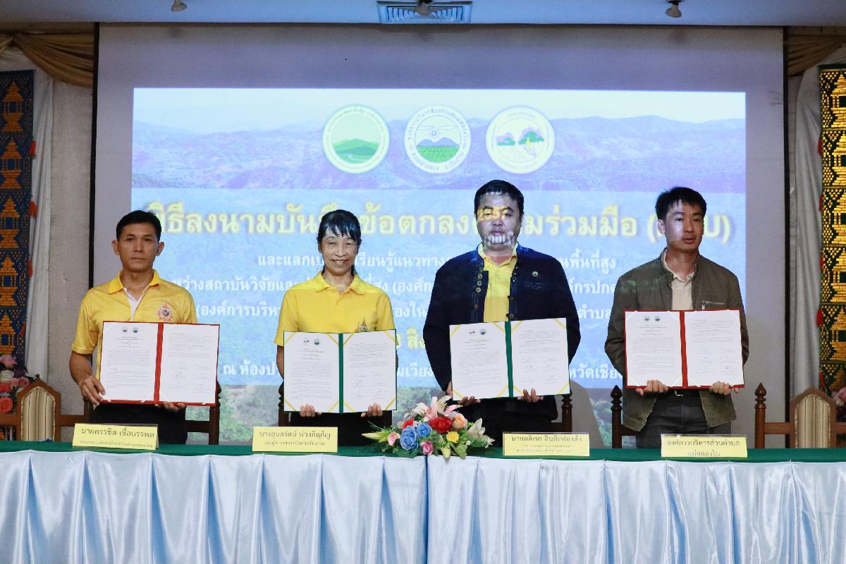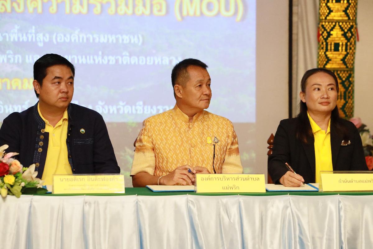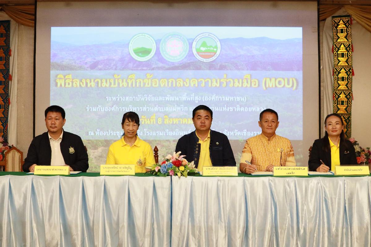 ซึ่งก่อนการเปิดประชุมนางอุบลรัตน์ พ่วงภิญโญ รองผู้ว่าราชการจังหวัดเชียงราย ได้ร่วมเป็นสักขีพยานในพิธีลงนามบันทึกข้อตกลงความร่วมมือ (MOU) เพื่อการพัฒนาพื้นที่สูงอย่างยั่งยืนแบบโครงการหลวง ระหว่างองค์การบริหารส่วนตำบลในพื้นที่ดำเนินงาน 3 แห่ง อุทยานแห่งชาติดอยหลวง สำนักบริหารพื้นที่อนุรักษ์ที่ 15 เชียงราย และสถาบันวิจัยและพัฒนาพื้นที่สูง เพื่อบูรณาการแผนปฏิบัติงานร่วมกัน พัฒนาประชาชนบนพื้นที่สูงให้มีการประกอบอาชีพ ที่สอดคล้องกับหลักปรัชญาเศรษฐกิจพอเพียง และตามแนวทางของโครงการหลวง เพื่อให้ชุมชนมีความเข้มแข็งสามารถพึ่งพาตนเองได้ เป็นชุมชนอยู่ดีมีสุข ประกอบอาชีพควบคู่ไปกับการฟื้นฟูและอนุรักษ์ทรัพยากรธรรมชาติและสิ่งแวดล้อม