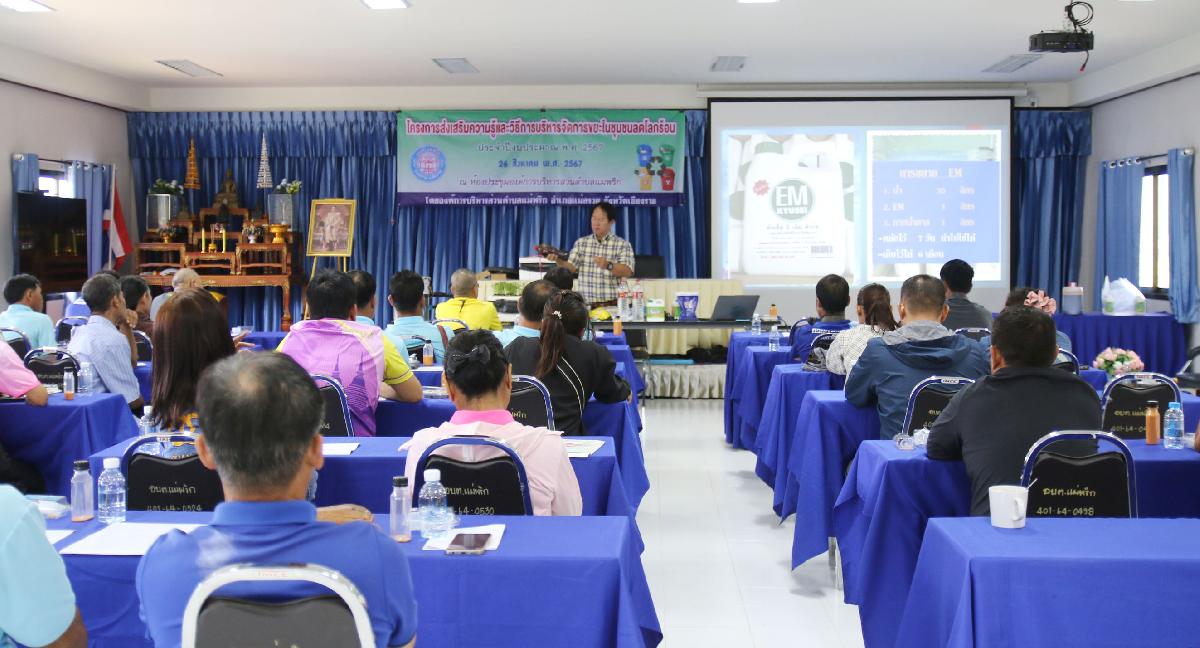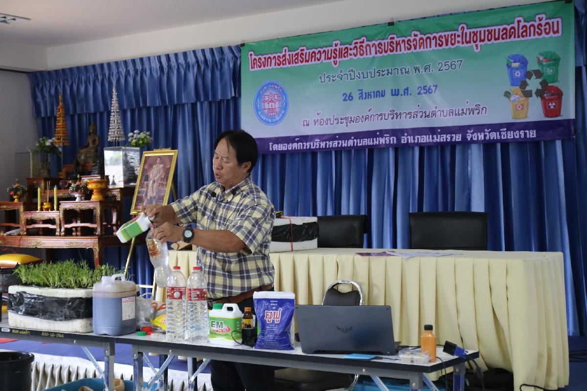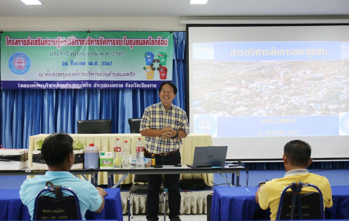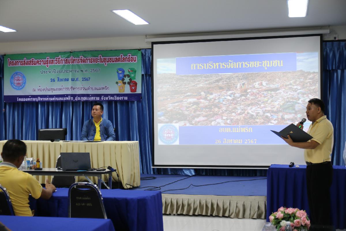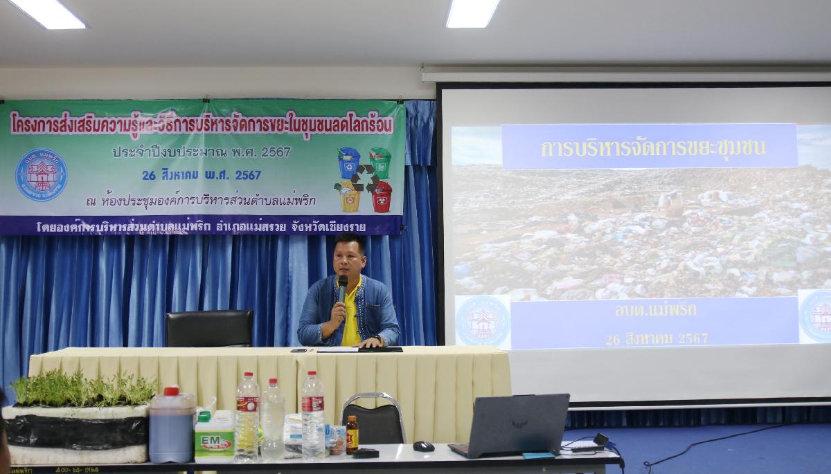 วันที่ 26 สิงหาคม 2567 เวลา 09.00 น. นายอุทัย ฟูวงศ์ นายกองค์การบริหารส่วนตำบลแม่พริก มอบหมายให้นายชยานนท์ โลชา รองนายกองค์การบริหารส่วนตำบลแม่พริก เป็นประธานเปิดโครงการส่งเสริมความรู้และวิธีการบริหารจัดการขยะในชุมุมชนลดโลกร้อน ประจำปีงบประมาณ 2567 เป็นการให้ความรู้แก่ประชาชนและชุมชนได้ตระหนักและรับรู้ ถึงความจำเป็นในการคัดแยกขยะและการใช้ประโยชน์จากขยะและของเสีย เป็นการลดปริมาณขยะที่มีประสิทธิภาพ เพื่อป้องกันการเกิดปัญหาโลกร้อนและปัญหามลพิษที่จะเกิดขึ้นในอนาคต โดยมีผู้นำชุมชน กำนัน ผู้ใหญ่บ้าน สมาชิก อบต. และอสม. ของตำบลแม่พริก จำนวน 50 คน เข้าร่วมอบรบ ณ ห้องประชุมองค์การบริหารส่วนตำบลแม่พริก