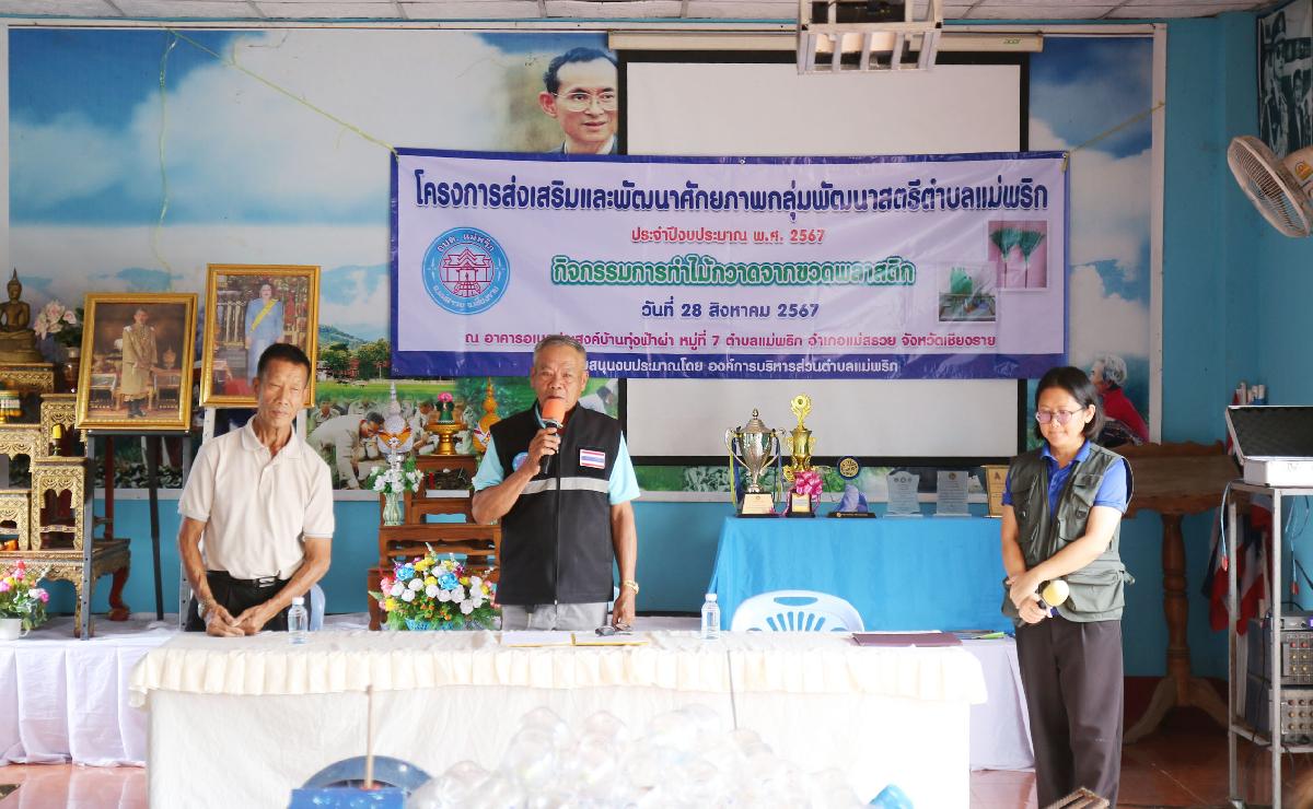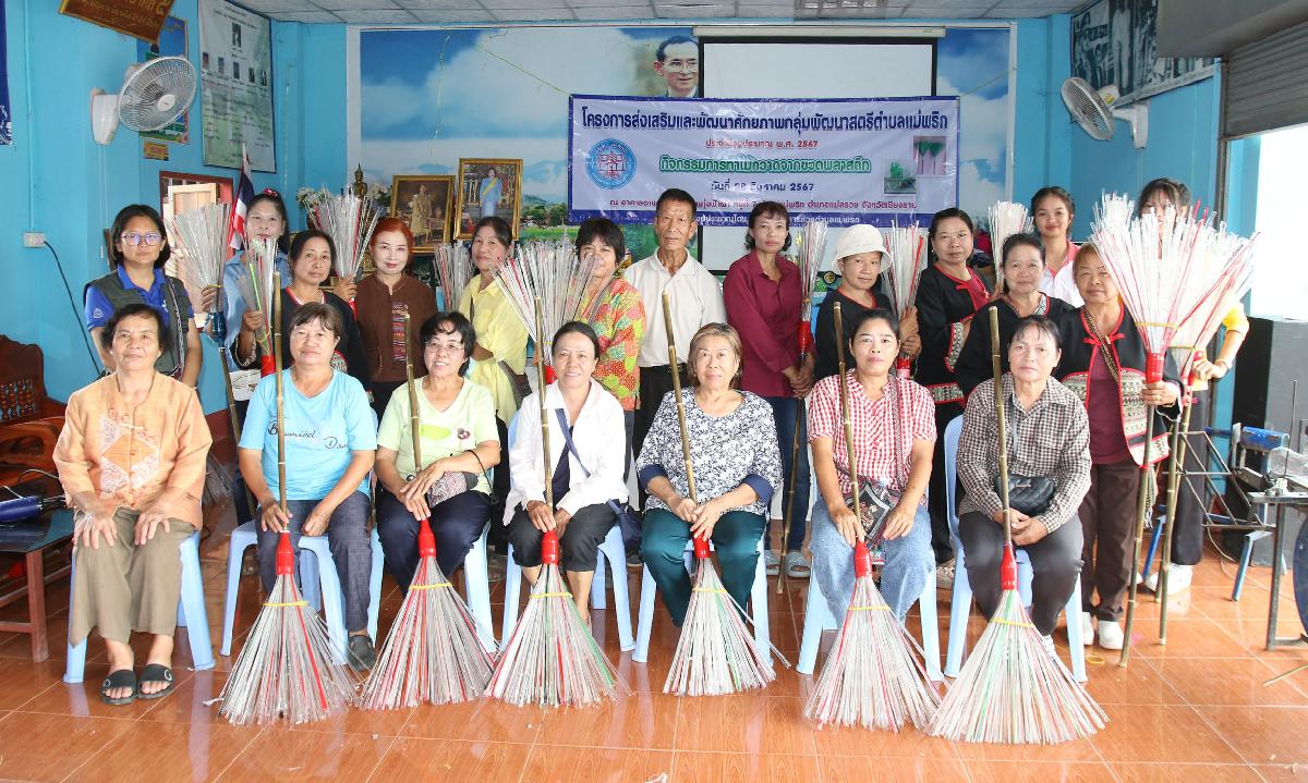 วันที่ 28 สิงหาคม 2567 องค์การบริหารส่วนตำบลแม่พริก ได้ดำเนินโครงการส่งเสริมและพัฒนาศักยภาพกลุ่มพัฒนาสตรีตำบลแม่พริก ประจำปีงบประมาณ พ.ศ. 2567 “กิจกรรมการทำไม้กวาดจากขวดพลาสติก” โดยใช้ประโยชน์จากขวดน้ำพลาสติกที่เหลือใช้ เพื่อส่งเสริมความรู้ด้านอาชีพ และสามารถนำไปสร้างรายได้เสริมได้ ให้แก่กลุ่มพัฒนาสตรีตำบลแม่พริก โดยได้รับเกียรติจาก นายสนอง กำลังประสิทธิ์ เป็นประธานในพิธีเปิดโครงการฯ ณ อาคารอเนกประสงค์บ้านทุ่งฟ้าผ่า หมู่ 7 ตำบลแม่พริก อำเภอแม่สรวย จังหวัดเชียงราย