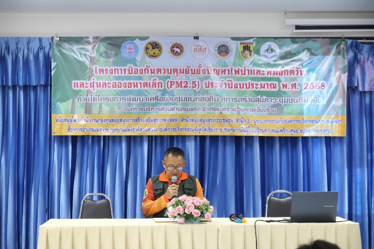 วันที่ 25 กุมภาพันธ์ 2568 องค์การบริหารส่วนตำบลแม่พริก ได้ดำเนินโครงการป้องกันควบคุมยับยั้งปัญหาไฟป่าและหมอกควัน และฝุ่นละอองขนาดเล็ก PM2.5 ประจำปีงบประมาณ พ.ศ. 2568 ภายใต้โครงการ พัฒนาเครือข่ายชุมชนท้องถิ่น สู่การสร้างสุขภาวะชุมชนที่ยั่งยืน โดยได้รับเกีรยติจาก นายอุทัย ฟูวงค์ นายกองค์การบริหารส่วนตำบลแม่พริก เป็นประธานในพิธีเปิดโครงการฯ พร้อมด้วย รองนายก เลขานุการ ปลัดอบต.แม่พริก หัวหน้าส่วนราชการ เจ้าหน้าที่พนักงาน ชมรมกำนันผู้ใหญ่บ้านตำบลแม่พริก เข้าร่วมการอบรมครั้งนี้ ซึ่งได้รับเกียรติจากกรมควบคุมไฟป่า จังหวัดเชี่ยงราย เป็นวิทยากรให้ความรู้เกี่ยวกับวิกฤติไฟป่าและหมอกควันพิษ หมอกควันที่เกิดจากไฟป่า ขนาดอนุภาคที่เป็นอันตรายต่อสุขภาพมนุษย์ เทคนิคการดับไฟป่า และการใช้แอพพลิเคชั่นช่วยในการป้องกันและบรรเทาสาธารณภัย ณ ห้องประชุมองค์การบริหารส่วนตำบลแม่พริก