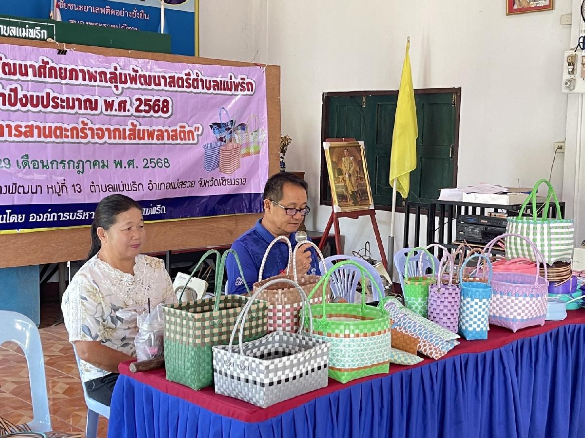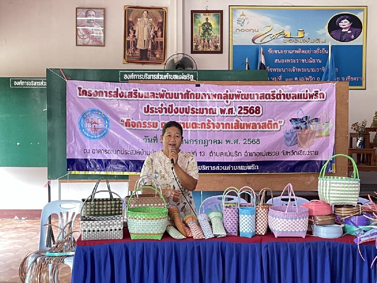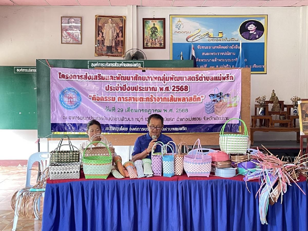 วันที่ 29 กรกฎาคม 2568 องค์การบริหารส่วนตำบลแม่พริก ได้ดำเนินโครงการส่งเสริมและพัฒนาศักยภาพกลุ่มพัฒนาสตรีตำบลแม่พริก ประจำปีงบประมาณ พ.ศ. 2568 “กิจกรรมการสานตะกร้าจากเส้นพลาสติก” เพื่อส่งเสริมความรู้ด้านอาชีพ สามารถช่วยเหลือตนเองได้ มีคุณภาพชีวิตที่ดีขึ้นตามศักยภาพ และสามารถนำไปสร้างรายได้เสริม ให้แก่ผู้การและผู้ด้อยโอกาส โดยได้รับเกียรติจาก นายอุทัย ฟูวงค์ นายกองค์การบริหารส่วนตำบลแม่พริก เป็นประธานในพิธีเปิดโครงการฯ ณ อาคารอเนกประสงค์บ้านป่าซางพัฒนา หมู่ 13 ตำบลแม่พริก อำเภอแม่สรวย จังหวัดเชียงราย