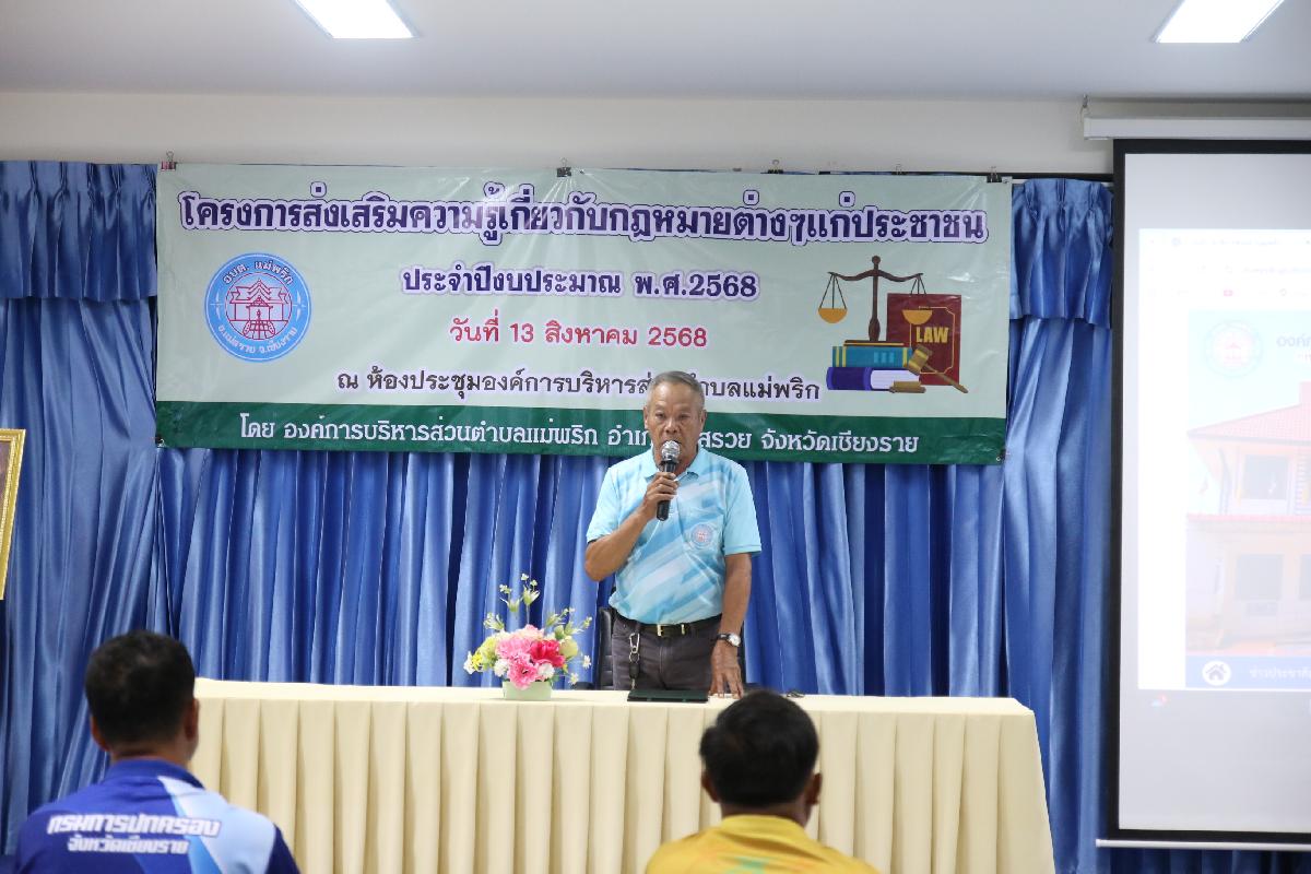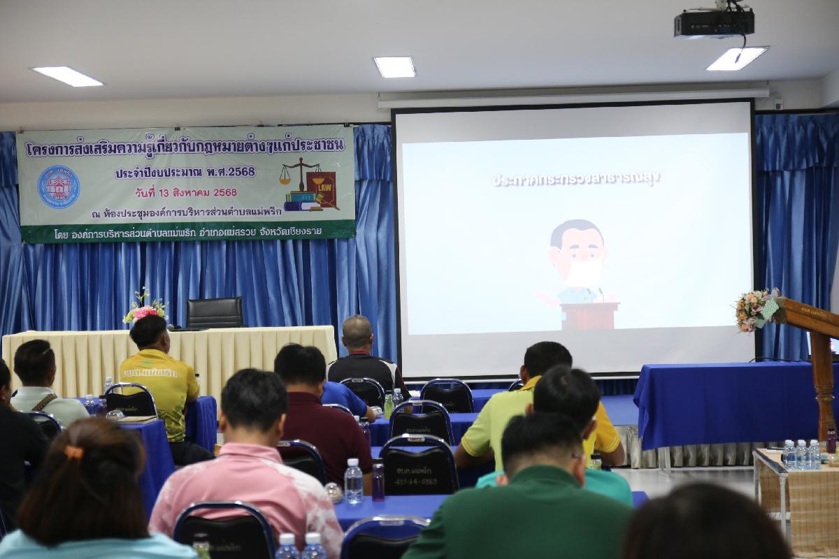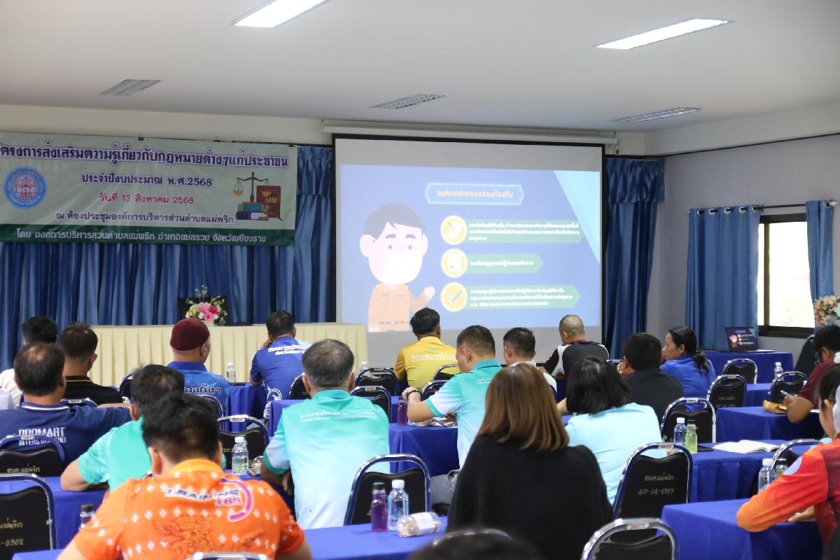วันที่ 13 สิงหาคม 2568 องค์การบริหารส่วนตำบลแม่พริก ได้จัดกิจกรรมโครงการส่งเสริมความรู้เกี่ยวกับกฎหมายต่าง ๆ แก่ประชาชน เพื่อเป็นการให้ความรู้แก่ประชาชน ป้องกันไม่ให้เกิดการละเมิดกฎหมาย ตลอดจนให้ความรู้และสร้างจิตสำนึกที่ดีให้สังคม ประชาชนได้ทราบกฎหมายในการใช้ชีวิตและอยู่ร่วมกันอย่างสันติสุข ณ ห้องประชุมองค์การบริหารส่วนตำบลแม่พริก