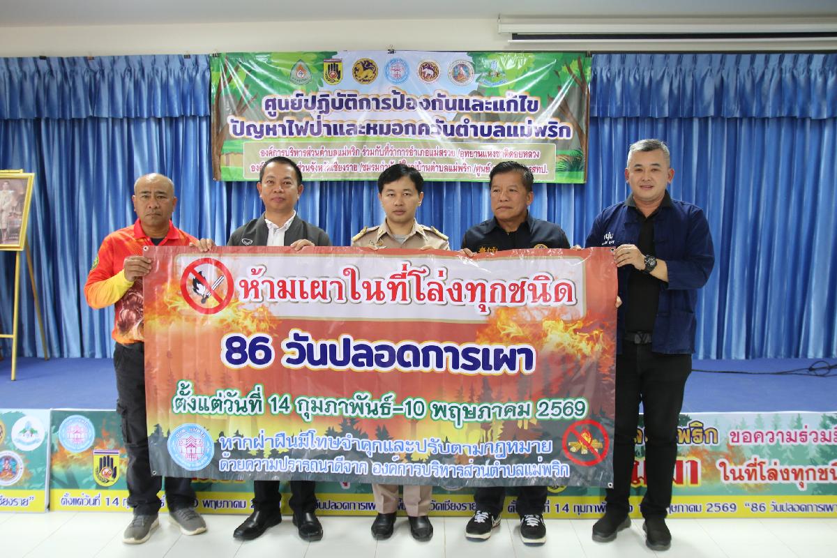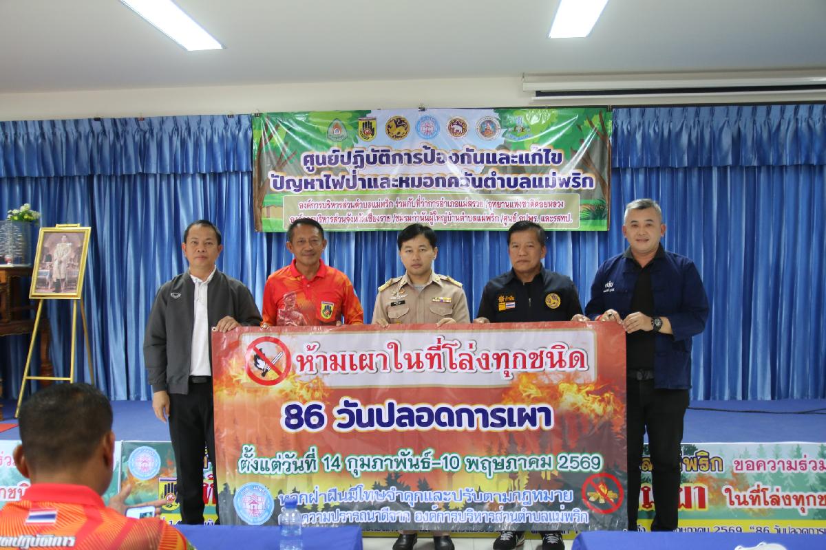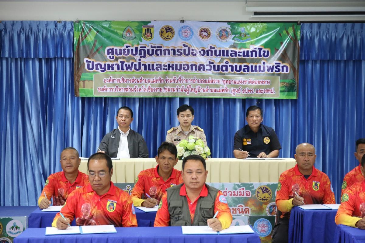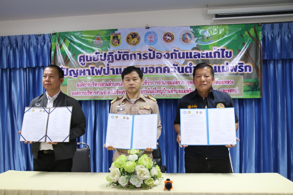 วันที่ 16 กุมภาพันธ์ 2569 นายปฤษฎางค์ สามัคคีนิชย์ นายอำเภอแม่สรวย มอบหมายให้ นายปัณณทัต อิ่นคำ ปลัดอำเภอ (จพง.ปค.ชำนาญการ) เป็นประธานในพิธีลงนามบันทึกข้อตกลง (MOU) ด้านการป้องกันและแก้ไขปัญหาไฟป่าและหมอกควันระดับตำบล ปี 2569 ณ ห้องประชุมองค์การบริหารส่วนตำบลแม่พริก โดยนายปรีชา วงค์มูล ปลัดองค์การบริหารส่วนตำบลแม่พริก ปฏิบัติหน้าที่ นายกองค์การบริหารส่วนตำบลแม่พริก ในฐานะผู้อำนวยการศูนย์บัญชาการเหตุการณ์ป้องกันและแก้ไขปัญหาไฟป่าและหมอกควันตำบลแม่พริก กับ นายอำเภอแม่สรวย กำนัน ผู้ใหญ่บ้านตำบลแม่พริก หัวหน้าหน่วยพิทักษ์อุทยานแห่งชาติที่ ดล.5 ปางอ้อย ประธานศูนย์อาสาสมัครป้องกันภัยฝ่ายพลเรือนตำบลแม่พริก เพื่อให้การดำเนินการป้องกันและแก้ไขปัญหาไฟป่าและ หมอกควันในพื้นที่เป็นไปในทิศทางเดียวกัน เกิดความคุ้มค่าและบังเกิดประโยชน์สูงสุด จึงตกลงความร่วมมือ ดังนี้