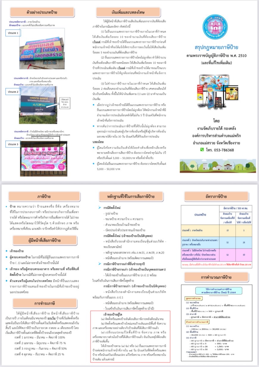 องค์การบริหารส่วนตำบลแม่พริกขอประกาศให้เจ้าของป้ายและผู้ครอบครองป้ายดำเนินการยื่นแบบแสดงรายการภาษีป้าย (ภ.ป.1) และชำระภาษีป้ายประจำปี พ.ศ. 2569 ตั้งแต่วันที่ 5 เดือน มกราคม พ.ศ. 2569 จนถึงวันที่ 31 เดือน มีนาคม พ.ศ. 2569 ณ งานจัดเก็บรายได้ กองคลัง องค์การบริหารส่วนตำบลแม่พริก ในวันและเวลาราชการหรือติดต่อทางเบอร์โทรศัพท์ 053-786368 ต่อ 102 รายละเอียดดังเอกสารที่แนบมาพร้อมนี้